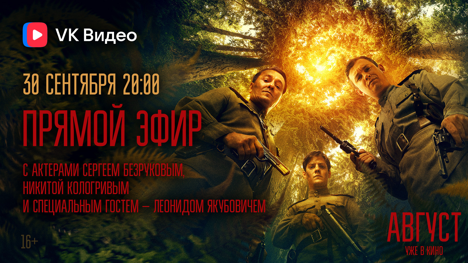 Актеры фильма «Август» встретятся с вами в прямом эфире в VK Видео. Вместе с Сергеем Безруковым, Никитой Кологривым и специальным гостем Леонидом Якубовичем у вас будет уникальная возможность обсудить картину «Август».