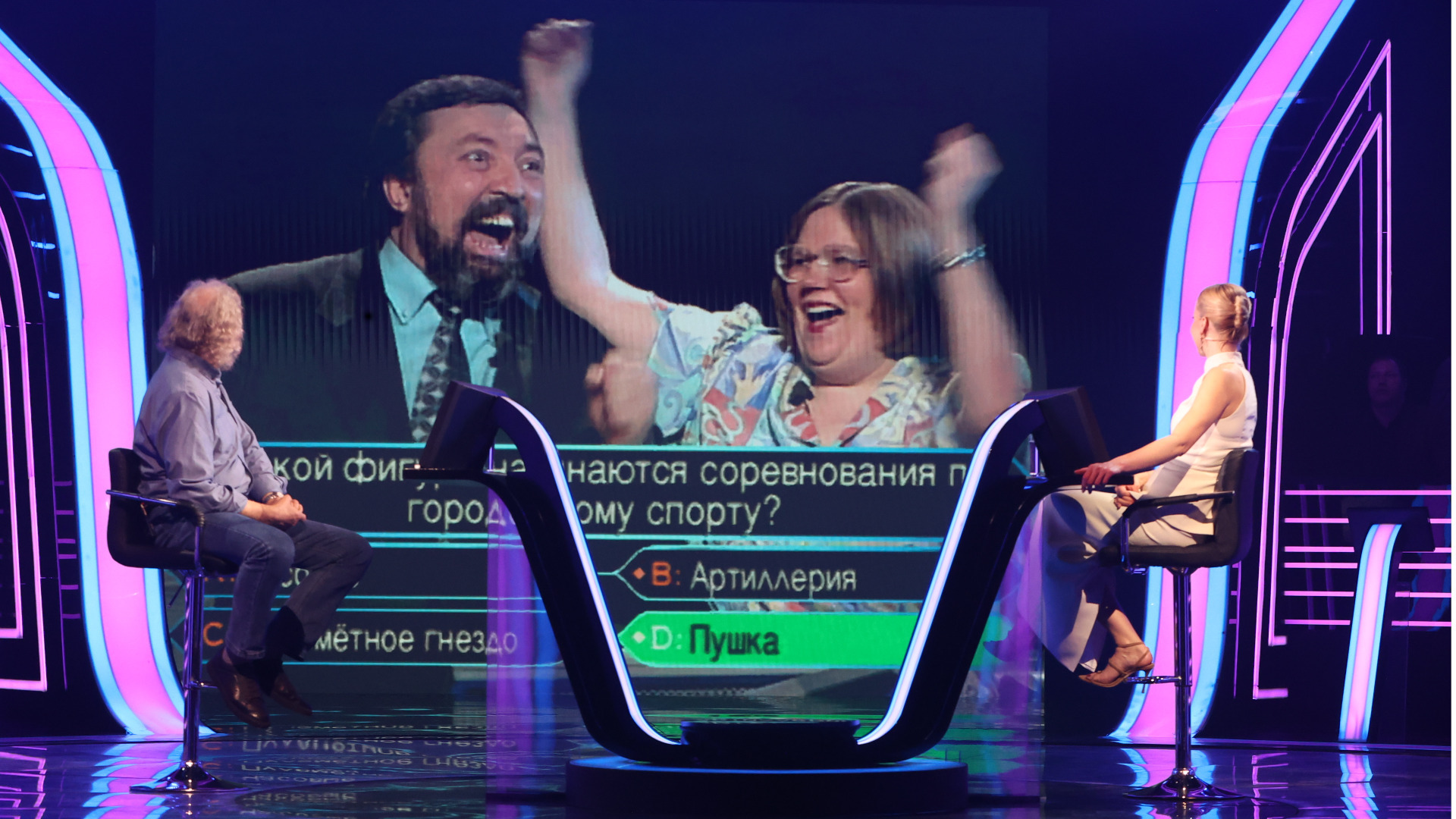 Изображение © Первый канал, АОПятнадцатый вопрос, доставшийся семье Чудиновских, был про городки, в которые никто из них не играл. Звучал он так: с какой фигуры начинаются соревнования по городошному спорту? Варианты ответа: часовые, артиллерия, пулеметное гнездо, пушка. «Ты не разведешься со мной, если мы ошибемся?» — спросил Юрий жену. И вдруг вспомнил, как бегемот в мультфильме «Ну, погоди!» аккуратно складывал на поле деревянные цилиндры... Ответ «пушка» принес семье Чудиновских миллион.